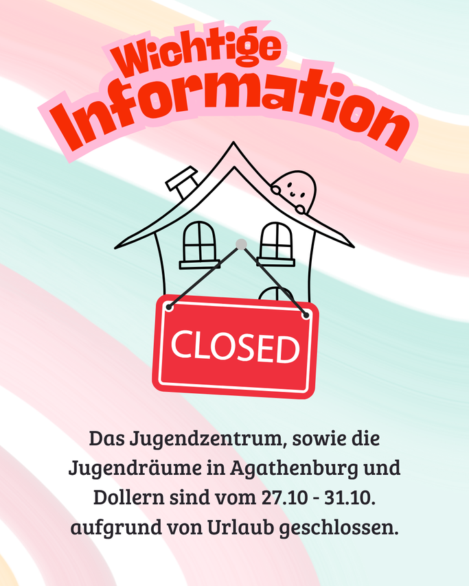 Das Jugendzentrum Speedy sowie die Jugendräume in Agathenburg und Dollern bleiben in der Zeit vom 27.10. bis 31.10. aufgrund von Urlaub geschlossen.
